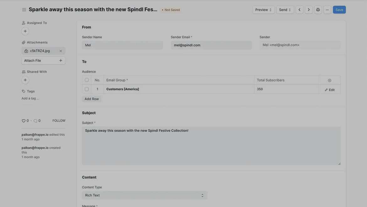 Our open-source CRM tool makes your lead closure soar. Use email campaigns for targeted marketing, send bulk emails to your customers with beautiful newsletters, and reap