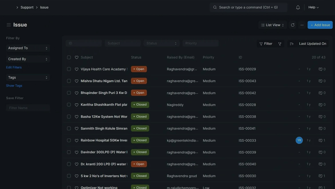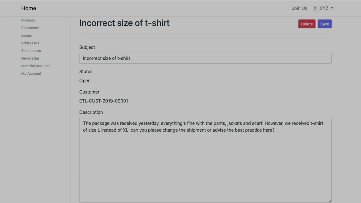 Level up your customers' interaction with your system and boost customer experience. Your clients can track the status of their issues and your team's correspondence in ERPNext's Issue Portal. Just invite customers as users in your ERPNext account and let them reap the benefits of full transparency — opening sales orders, tracking shipments via delivery note status, raising issue tickets, and tracking resolution details.